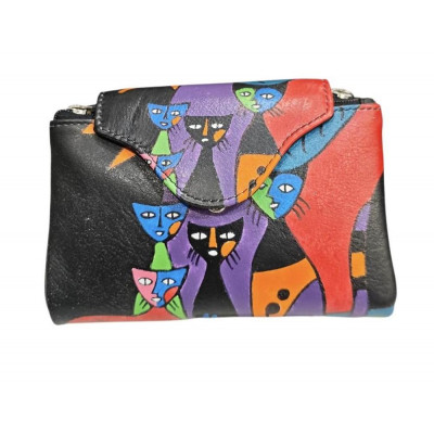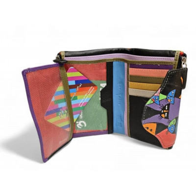 Billetera realizada en piel vacuno de tacto suave, con estampado de gatos pintada a mano. Lleva doble monedero de cremallera capacidad para 12 tarjeta y dos espacios para fotos o carnet, doble departamento para billetes. Cierre de botón doble para según valla de llena .Viene con protección de identificación por radiofrecuencia incorporada, que evita que accidentalmente se puedan leer los datos de tus tarjetas de crédito con RFID.